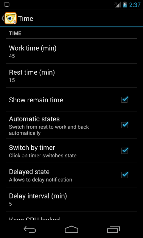 This application helps you to keep track of the time of breaks when work with screen. You can comfortably control the timer by application, by widget or by permanent notification.