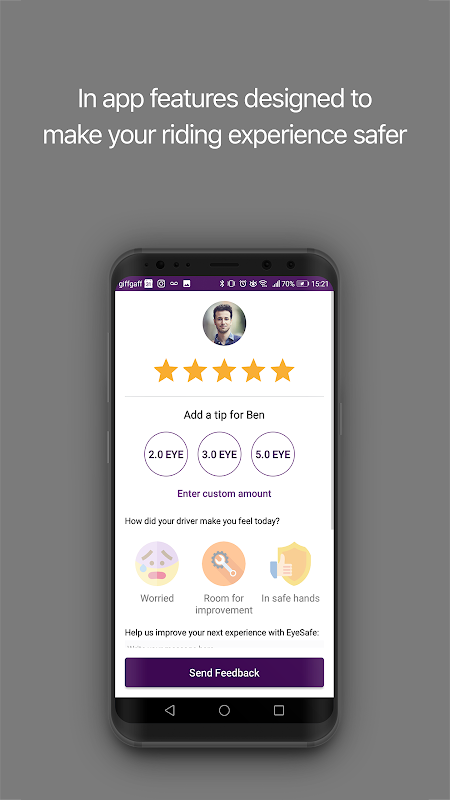 ما Eye Safe را با در نظر داشت ایمنی و امنیت ما ایجاد کردیم. ما مشغول توسعه ویژگی های ایمنی بیشتری هستیم که در هنگام سفر به شما آرامش می بخشد. شبکه ما از شرکت های تاکسی مجاز به ما امکان می دهد: