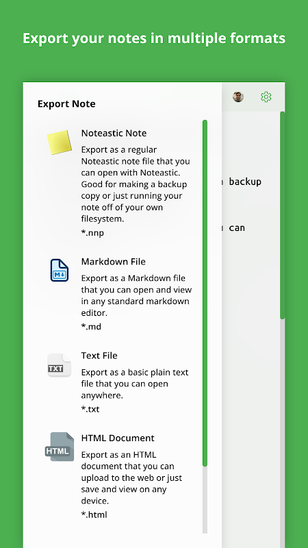 اگر با استفاده از حساب Ape Apps وارد سیستم شوید EZ Notepad از همگامسازی ابری پشتیبانی میکند و به شما امکان میدهد بدون توجه به دستگاهی که استفاده میکنید، یادداشتهای خود را با خود ببرید. همچنین میتوانید یادداشتهای خود را در قالبهای مختلف از جمله علامتگذاری، متن ساده، html و حتی PDF صادر کنید.
