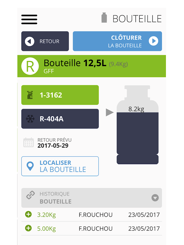 از جمع آوری تا بازگشت، راه حل ما به شرکت ها اجازه می دهد تا بدانند سیلندرها کجا هستند، مقادیر و انواع مبردهای باقی مانده در هر سیلندر، تکنسین هایی که آنها را مدیریت می کنند و از کدام تامین کنندگان خریداری شده اند. هر بار که تکنسین ها تراشه های O-tag را فعال می کنند، داده ها در Back Office به روز می شوند.