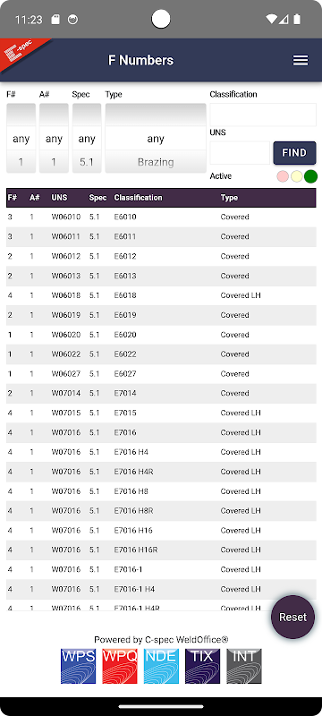 اعداد F: جستجوی سریع گروه بندی فلزات پرکننده برای روش جوشکاری و صلاحیت عملکرد. جستجو شامل طبقه بندی هایی با توضیحات مربوط به استفاده مورد نظر است. داده ها توسط C-spec ارائه شده است. تخصیص اعداد F و اعداد A بر اساس جدول ASME بخش IX QW-432 و QW-442، بخش ASME بخش II قسمت C، AWS B2.1 جدول B1 و B2، و AWS A5.1 تا AWS A5.36 است.