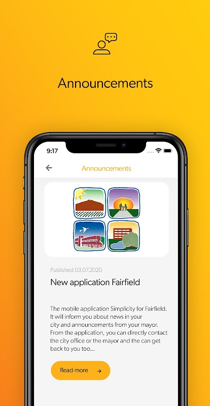 Simplicity mobile application for Fairfield. It will inform you about news in your city and announcements from your mayor. From the application, you can also directly contact the city office or the mayor and they can get back to you too.