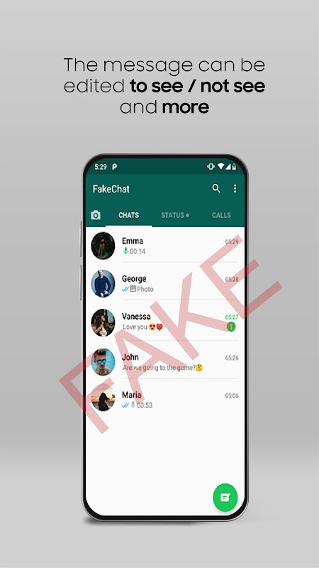 این برنامه فقط برای اهداف سرگرمی در نظر گرفته شده و به هیچ وجه به هیچ برنامه پیام رسان دیگری وابسته نیست. این به هیچ وجه با WhatsApp Inc وابسته نیست. فقط برای اهداف سرگرمی ساخته شده است و عملکرد واقعی پیام WhatsApp را ارائه نمی دهد.