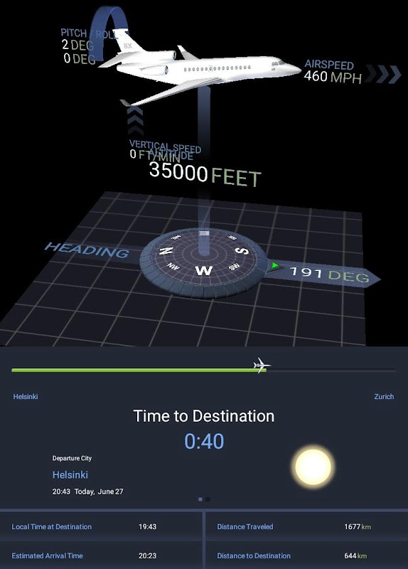 نماهای نقشه قابل انتخاب شامل پیش نمایش پرواز ، کل مسیر ، پرواز میانی ، زمان منطقه جهانی و ساعتهای جهانی است.