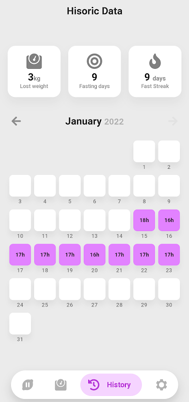 Keep track of your fasting schedule in a healthy way. Choose how long you want to fast for and when to start. You can also track your weight and BMI.