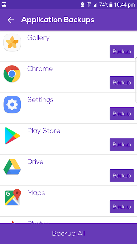 اول از همه تب کاربرد پشتیبان گیری باز (آندروید آیکون نماد)، لیستی از تمام برنامه های خود را نمایش داده خواهد شد، کلیک بر روی دکمه پشتیبان گیری برای تهیه نسخه پشتیبان برنامه شما و پشتیبان خود را کامل است.