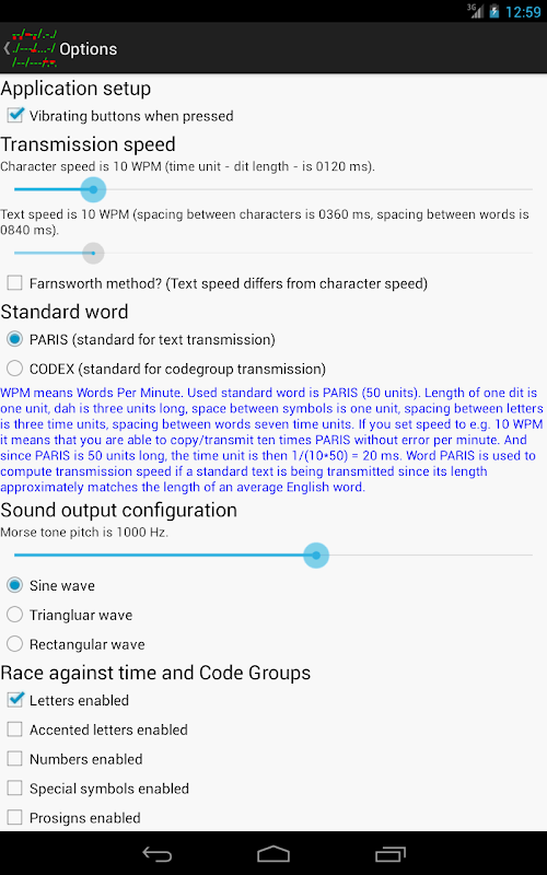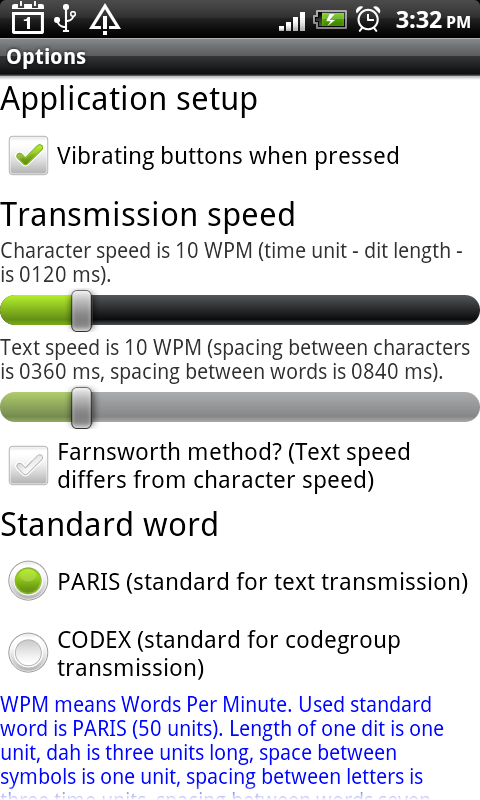 - سرعت قابل تنظیم خروجی صدا در کلمات در هر دقیقه. Farnsworth زمان انتقال کد مورس پشتیبانی می شود، کلمه استاندارد CODEX / PARIS پشتیبانی می شود