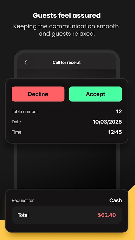 درخواست ها به وضوح برچسب گذاری شده اند، زمان مهر زده شده و به شماره جدول مرتبط هستند. کارکنان میتوانند جزئیات سفارش را بررسی کنند، دستورالعملهای ویژه را ببینند، اقدامات را بپذیرند یا رد کنند، و کارهای انجامشده را مستقیماً از برنامه نوار پیگیری کنند.