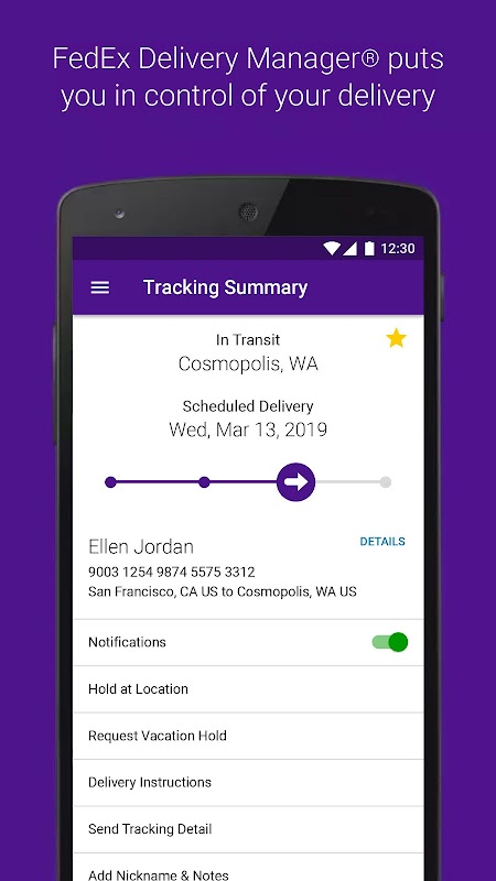 مدیر تحویل FedEx فقط برای تحویل مسکونی در ایالات متحده در دسترس است شما باید برای استفاده از ویژگی های انتخاب شده وارد برنامه FedEx Mobile شوید و در FedEx Delivery Manager ثبت نام کنید.