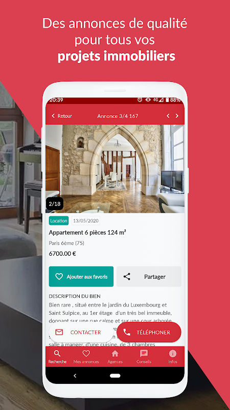 لذت بردن از یک نمای کلی از بازار املاک و مستغلات با بسیاری از خواص در دسترس: خرید، اجاره یا زندگی: آپارتمان، خانه، اتاق، استودیو، انبار، آپارتمان، کلبه، مزرعه، هتل، ماشین، بارج ، ویلا، ملک، زمین، ... جستجو پیشرفته شما اجازه می دهد برای به دست آوردن تبلیغات مرتبط مرتب شده بر اساس قیمت، متر مربع، تعداد اتاق و یا تاریخ.