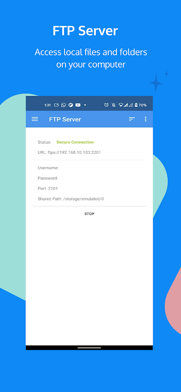 با استفاده از سرور FTP (پروتکل انتقال فایل) می توانید به فایل ها و پوشه تلفن خود در دستگاه های دیگر (مانند رایانه ، لپ تاپ ، iPad ، iPhone و غیره) که در همان شبکه متصل شده اند دسترسی پیدا کنید.