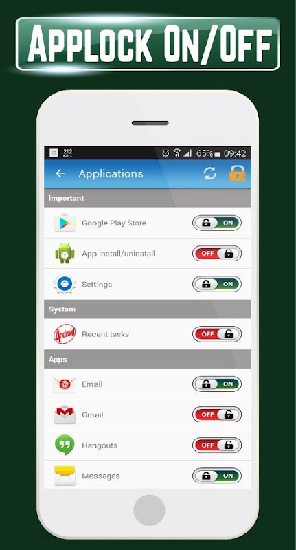 • Lock apps with password lock, pattern lock, or fingerprint lock.