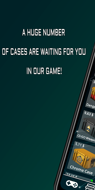 Download and play our game! Win various cs go skins from cases! Sell them to replenish your balance, or leave them in your personal inventory! Play roulette, place bets, double, or multiply your winnings up to 100 times! Endless inventory and a lot of interesting things are waiting for you in the game!