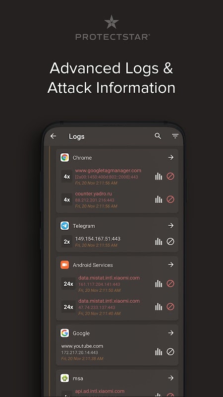 Wouldn't it be great if a firewall security could do much more than hacker protection including wifi blocker & anti spy detector against hacker attacks? The Protectstar™ no-root firewall AI was specially developed as a hacker protection to block unwanted access by known intelligence services & government organizations for anti hacker security privacy including anti malware removal.