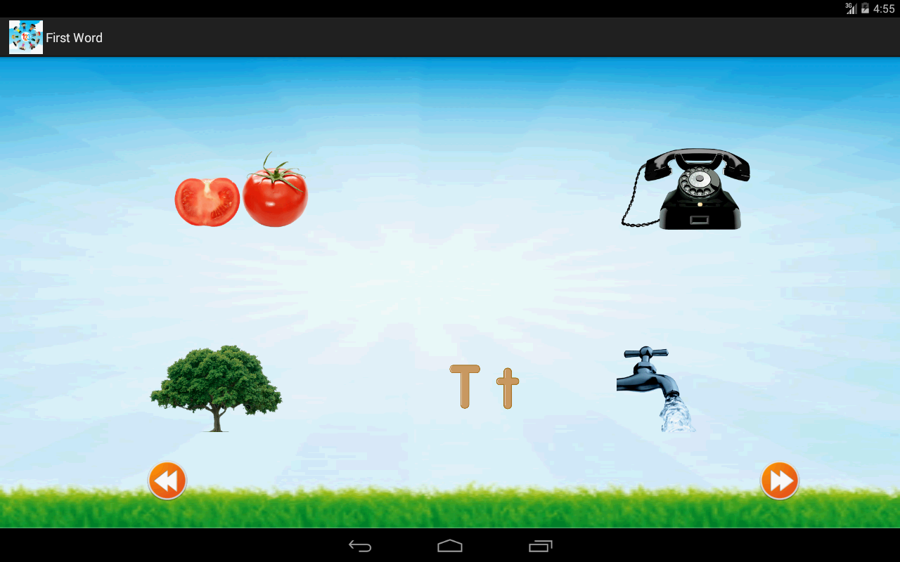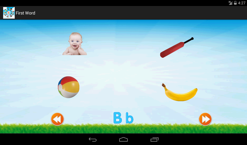 This application is very useful for the kids ( Age group of 2-4 years ) who has just started learning ABCD alphabets. It has alphabets in capital letter as well as in small letter. This application has four parts. The first screen will list all the alphabets with image. Clicking on any letter will self speaks the Alphabet .This application also helps your child to speak English alphabets.