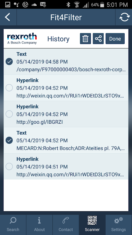 NEW: Fully integrated QR code reader that has the ability to recognize Bosch Rexroth Part Numbers. Scans are saved in your scan history and can be edited and even shared.