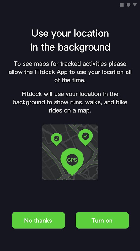 لطفاً توجه داشته باشید: Fitdock هنگام تمرین از موقعیت مکانی شما در پسزمینه استفاده میکند. نقشه ای از فعالیت شما ترسیم می کند و داده های تمرینی دقیقی را ارائه می دهد.