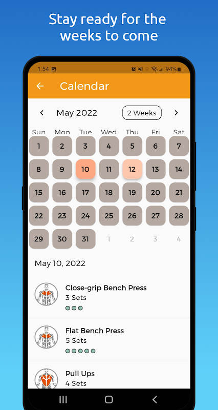 - مشاهده تمام تمرینات در یک نمای تقویم با نمایش هفتگی، دو هفته ای و ماهانه
