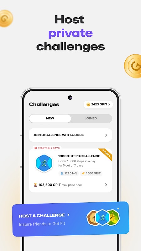 در این برنامه پیاده روی پویا به چالش های عمومی بپیوندید یا با دوستان خود چالش های سفارشی ایجاد کنید. اهداف و هزینه ورودی خود را تعیین کنید. همانطور که پیشرفت می کنید، سکه های GRIT خود را پس می گیرید. وقتی برنده میشوید، جوایز بیشتری کسب میکنید، و هر چالشی را فرصتی برای دریافت پول برای راه رفتن میکنید در حالی که ردیاب و گام شمار شما از دقت اطمینان میدهند.