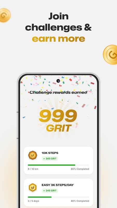 هر روز، ردیاب گام های ما یک هدف پیاده روی سفارشی را به شما اختصاص می دهد. با استفاده از برنامه پیاده روی ما به هدف خود برسید و ردیاب پیاده روی ما پیشرفت شما را به روز می کند. به سطح جدیدی برسید و با به دست آوردن سکه های GRIT برای راه رفتن پول دریافت کنید، در حالی که هر مرحله توسط گام شمار ما که با google fit همگام شده است ثبت می شود.