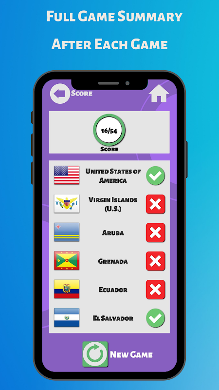 این بازی پرچم به طور ویژه با ترکیبی از انواع بازی های مسابقه موجود و ویژگی های آزمون های متعدد طراحی شده است. این بازی به شما یک فرآیند یادگیری سرگرم کننده می دهد که دانش و مهارت های بازی های حافظه شما را بهبود می بخشد! شما از این تلاش تطبیق پرچم در حین آزمایش دانش پرچم خود لذت خواهید برد!
