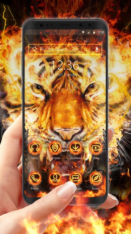 1. Flame Cool Tiger- APUS Launcher Free Theme is free, but only compatible with APUS Launcher. If you want to apply it, please install APUS Launcher on your Android phone. Or download new theme and APUS Launcher. When you install APUS Launcher, there are variety of themes in APUS theme & wallpaper shop, such as phonex, lovely unicorn, pink diamond mickey, Red heart, luxury, gold, business, black, simple, magic, comic, football, basketball, cricket, Valentine's Day, New Year, Halloween, Christmas, cute cat and dog, butterfly, dawn theme. Install APUS launcher to enjoy more themes.