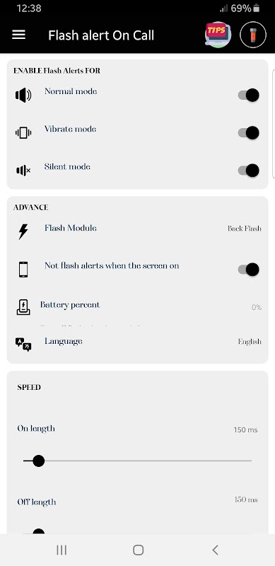 فلاش تماس ورودی قابل تنظیم و اعلانهای تماس/تماس ورودی و چراغ قوه شما را قادر میسازد تا مدت زمان روشن و خاموش شدن فلاش LED برای هشدارها را هر بار که چشمک میزند، انتخاب کنید. همچنین می توانید انتخاب کنید که چند بار برای پیام های متنی SMS چشمک بزند.