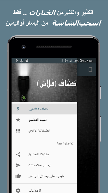 ✔ تنظیمات برای کنترل چراغ قوه در راه اندازی برنامه و زمانی که برنامه ترک، برای اولین بار "روشن کردن چراغ قوه زمانی که برنامه شروع می شود"، دوم این است "نگه داشتن چراغ قوه در هنگام ترک برنامه" -> شما می توانید برنامه "تنظیمات" در پایین پیدا کنید از منوی سمت چپ