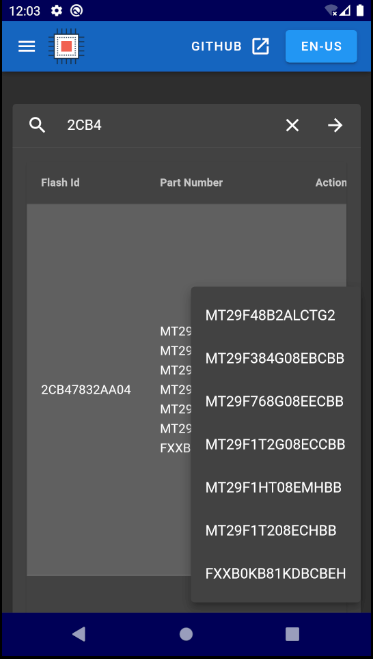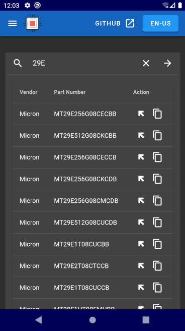 Quickly and conveniently query various NAND Flash Part Numbers and ID information on your Android Device.