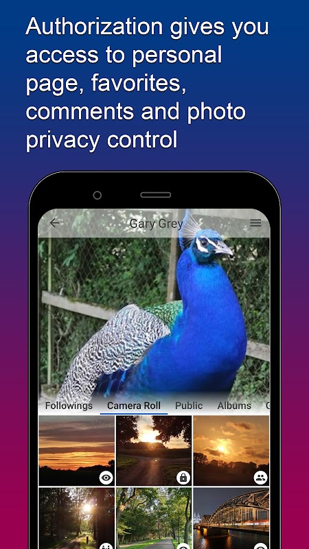 Flickr Droid از 2 حالت کار با و بدون مجوز پشتیبانی می کند. پس از ورود به سیستم ، به صفحه شخصی خود ، افزودن عکسهای مورد علاقه ، ارسال نظر و کنترل حریم خصوصی عکس های خود دسترسی پیدا می کنید.