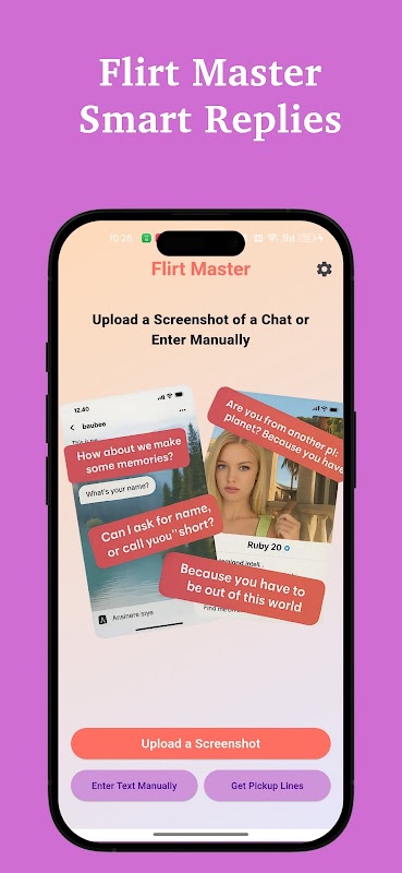 پاسخ های هوشمند: برای دریافت پاسخ های هوشمندانه و متناسب با زمینه، اسکرین شات های چت را آپلود کنید یا متن را به صورت دستی وارد کنید. خواه یک موقعیت دشوار باشد یا فقط شوخی های روزمره، Flirt Master پاسخ های متناسب با لحظه را به شما ارائه می دهد.
