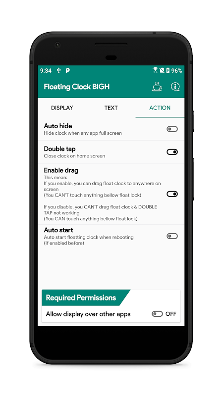 Useful for you when on full-screen apps like watching film, play game, ect... with Floating Clock.