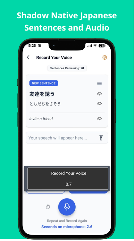 محتوا JLPT N5 تا N1 را در 25 سطح فرعی پوشش میدهد. سه حالت ضبط: Echo Fluency (خودکار)، زمانبندی شده یا نگه داشتن برای ضبط. تصویرگر لهجه گام برای اصلاح تلفظ.
