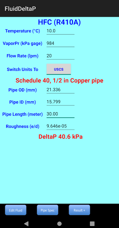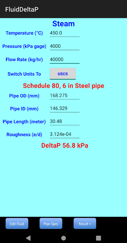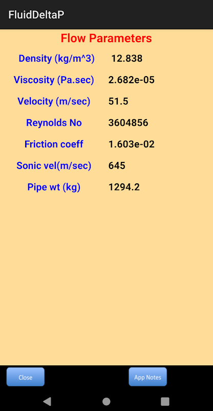 سرعت سیال، تعداد رینولدز و ضریب اصطکاک لوله به صورت تابع اندازه لوله، چگالی مایع و ویسکوزیته محاسبه می شود. الگوریتم خود الگوریتم خود را برای محاسبه ضریب اصطکاک لوله بر اساس فاکتور زبری و تعداد رینولدز در شرایط آشفتگی و برای لمینار صرفا عملکردی از تعداد رینولدز و صرف نظر از زبری بودن لوله است. برای دقت بیشتر کاربران می توانند عامل ناهمواری لوله را ویرایش کنند. برای گازها، اطلاعات اضافی در مورد سرعت صوتی برای مرجع سریع ارائه شده است. این نیز در تعیین میزان افت فشار با استفاده از روش های دیگر کاربر کمک می کند.