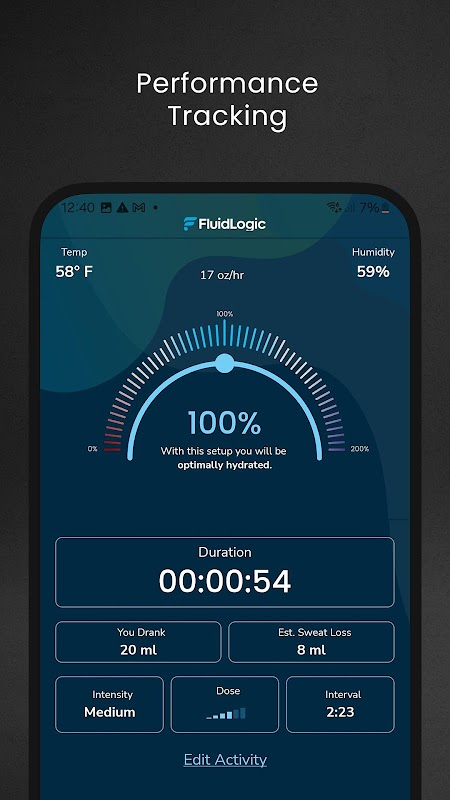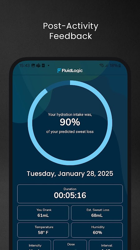 FluidLogic از الگوریتم های اختصاصی برای تخمین از دست دادن عرق شما بر اساس بیومتریک، شدت فعالیت، دما و رطوبت استفاده می کند. این برنامه یک برنامه هیدراتاسیون شخصی ارائه می دهد تا شما را به طور مطلوب هیدراته نگه دارد.