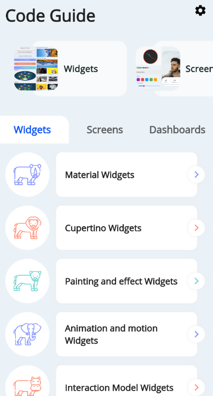 راهنمای کد Flutter اجزای مختلف فلاتر، ویجت ها، صفحه نمایش را از طریق نسخه نمایشی با نمای کد منبع کنار هم ارائه می دهد.