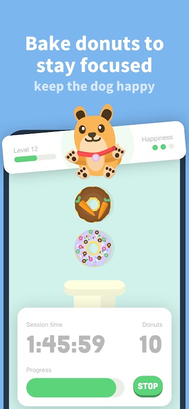 آیا با اعتیاد به تلفن و حواس پرتی مبارزه می کنید؟ برنامه بهره وری ما اینجاست تا به شما کمک کند! با تایمر Pomodoro ما، میتوانید همزمان با ایجاد عادات سالم، روی کارهای مهم خود تمرکز کنید. دستگاه دونات این برنامه به شما امکان می دهد برای سگ مجازی خود، Focus، که نیاز به تغذیه منظم دارد، دونات تولید کنید.