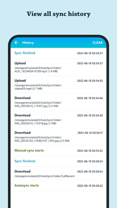 میتوانید تمام تاریخچه همگامسازی را با گذشت زمان مشاهده کنید - فایلهای آپلود شده، فایلهای دانلود شده یا هر گونه خطای رخ داده است. می توانید تاریخچه را پاک کنید.