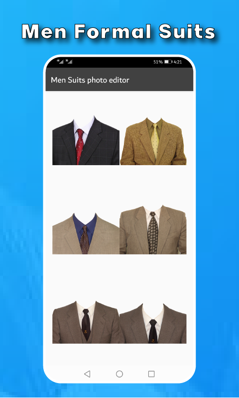 این برنامه شامل مجموعه مدرن از کت و شلوارهای رسمی مردانه شیک و مد روز است. شما می توانید کت و شلوار مورد نظر خود را از بسیاری از گزینه های کت و شلوار مردانه انتخاب کنید، بیش از 50 کت و شلوار مردانه فوق العاده در دسترس شماست. پس از انتخاب کت و شلوار مورد نظر خود، می توانید عکس خود را به صورت افقی یا عمودی بچرخانید و بچرخانید تا به درستی تنظیم شود. می توانید عکس خود را از گالری اضافه کنید یا از این نرم افزار غرفه دوربین عکس جدید بگیرید. این برنامه از تصاویر گالری و دوربین هر دو پشتیبانی می کند. عکس خود را با دوستان و خانواده خود از طریق رسانه های اجتماعی به اشتراک بگذارید.