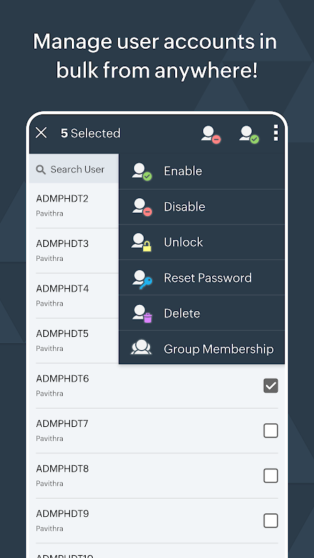 برنامه Active Directory Manager Lite به شما این امکان را می دهد تا حساب های کاربری موجود در Active Directory خود را فقط با استفاده از دستگاه های تلفن همراه خود مدیریت کنید. با این برنامه، گویی اکتیو دایرکتوری خود را در هر کجا که می روید همراه خود حمل می کنید. اکنون می توانید کاربران خود را به راحتی، در هر زمان و از هر نقطه از جهان، از طریق دستگاه های تلفن همراه خود مدیریت کنید.