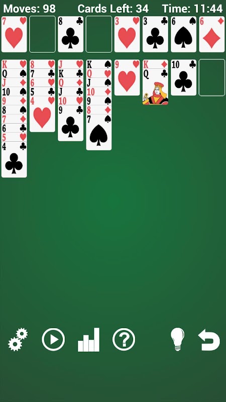 The object of the game is to create 4 stacks of cards, from A to K - A, 2, 3, 4, 5, 6, 7, 8, 9, 10, J, Q, K, one per suit in each of the four home cells marked with letter A. Single deck of cards is dealt face up in 8 columns. In game there are 4 home cells marked with letter A and 4 free cells. In free cells player can temporary store cards, one at a time, and in home cells player builds stacks of cards. Player can move cards from columns to free cells, from columns to columns and from columns to home cells. When moving from columns to columns cards must be placed on a column in descending order and alternating red and black. Player is allowed to move one or more cards at a time between columns. Player can move more cards at a time if all cards are alternating red and black and arranged in descending order. The game is won after all cards have been moved to home cells.