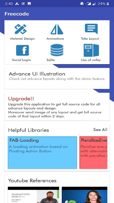 User can now find all code and illustration in a single android application. This application cover all the material design themes as well as social logins. Custom demonstration and