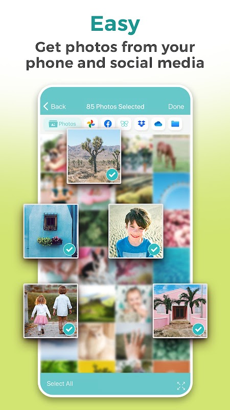 سفارش چاپ رایگان شما نمی تواند آسان تر باشد. فقط برنامه را باز کنید و عکس ها را از تلفن، فیس بوک، دراپ باکس و موارد دیگر انتخاب کنید. سپس مقادیر خود را انتخاب کنید و کارتان تمام است! چاپهای رایگان شما در عرض چند روز درب منزل شما میرسند - و تنها چیزی که میپردازید هزینه حمل و نقل ناچیز است.