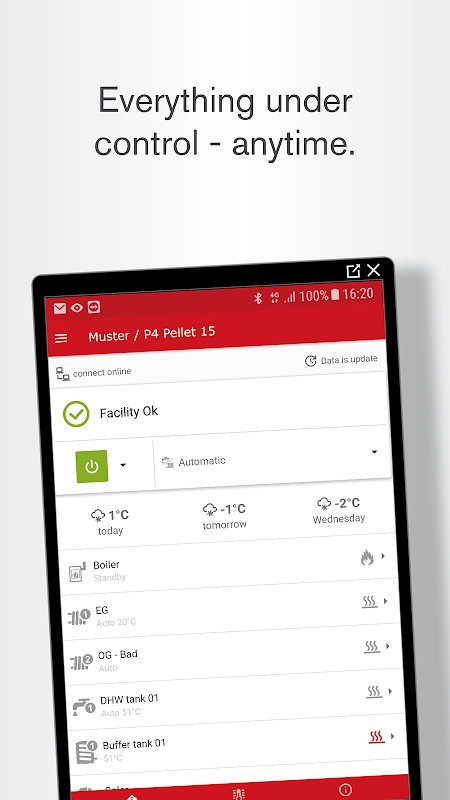با نرم افزار Fröling اتصال شما می توانید بررسی و کنترل دیگ بخار Fröling خود را در هر زمان از هر نقطه. در عرض چند ثانیه، شما یک دید کلی از وضعیت جاری سیستم و راحتی و به راحتی می توانید تغییر مهم ترین ارزش های وضعیت و تنظیمات. شما همچنین می توانید مجموعه ای که پیام های وضعیت شما می خواهم برای دریافت (به عنوان مثال زمانی که جعبه خاکستر کامل است و یا زمانی که یک پیام خطا نمایش داده می شود).