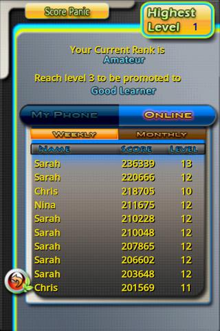- سطوح نامحدود! این نیاز تنها به مهارت های خود را برای شکستن یک سطح جدید. پیچیدگی از این بازی به تدریج افزایش می دهد از سطح به سطح. ممکن است شما تا به حال Level10 رسیدن در کلاسیک / ScorePanic حالت بازی؟ خوب، اجازه دهید را ببینید!