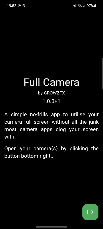 یک برنامه ساده و بدون حاشیه که به شما امکان می دهد از تمام صفحه خود برای مشاهده دوربین خود استفاده کنید. بسیاری از برنامهها دارای شبکهها و دکمههای بسیار زیادی هستند و نیمی از صفحه نمایش خود را از دست میدهید تا ببینید دوربین شما چه چیزی میبیند. این برنامه شامل چند دکمه کاربردی برای توقف و تعویض دوربین است و تمام.