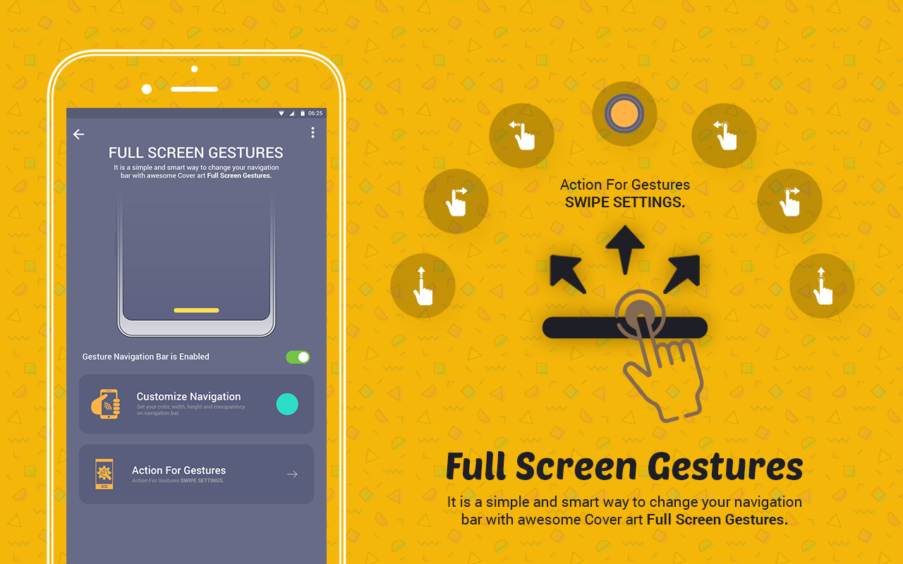 Full Screen Gestures or Swipe Gestures Control app helps you to change Navigation bar with smart touch gesture. It is a simple and smart way to change your navigation bar with awesome screen gesture. Full Screen Gestures is best app which easily convert your simple mobile navigation gestures into smart touch, Just swipe your finger into navigation area and get instant mobile touch with your gesture choice.