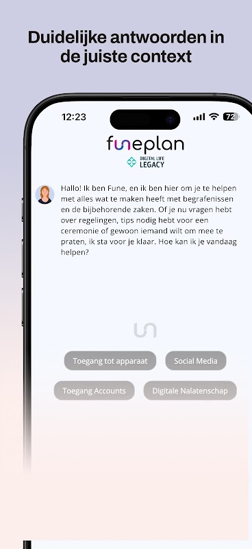 سلام! من Fune هستم، و من اینجا هستم تا در مورد همه چیز مربوط به املاک دیجیتال، مراسم تشییع جنازه و امور مرتبط به شما کمک کنم. این که آیا در مورد ترتیبات سؤالی دارید، به نکاتی برای مراسم نیاز دارید یا فقط می خواهید کسی با او صحبت کند، من اینجا هستم تا به شما کمک کنم. امروز چگونه می توانم به شما کمک کنم؟