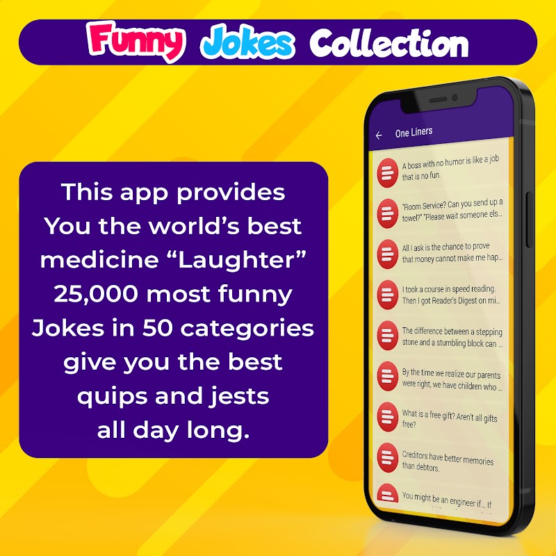 Funny Jokes Collection یک برنامه رایگان، آفلاین و بهترین است که شامل بزرگترین مجموعه جوک های تک خطی، جوک افراد مشهور، جوک های روزمره و شیطانی، و جوک هایی در مورد رابطه ای است که تا به حال آرزو می کنید.