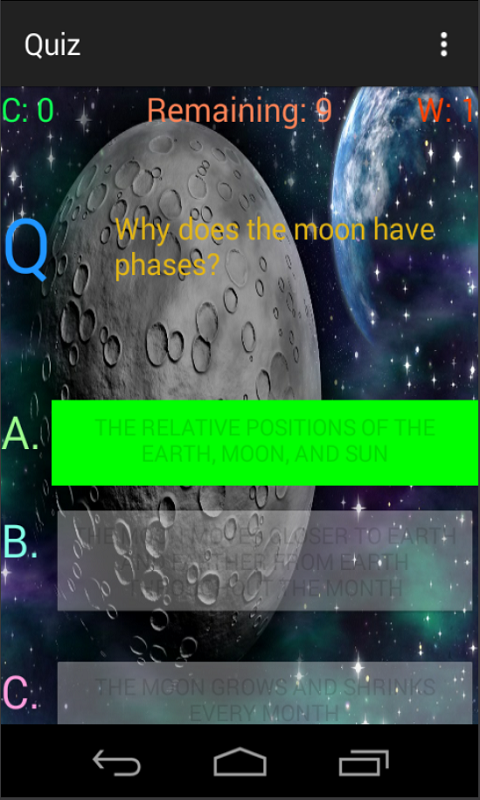 This app helps user to sharpening their knowledge and senses, help them to prepare for exams or tests which are based on astronomy and helps them to increase their knowledge and memory. This app targets people of all ages, even children could enjoy quizzes created by this trivia game and could enhance their Universe knowledge. This app contains cool features like coloring buttons green if the answer is correct otherwise colored it red because the answer is wrong. It contains good graphics and less ads. This app is extremely efficient, it is developed in such a way so that it could run smoothly in any android device.